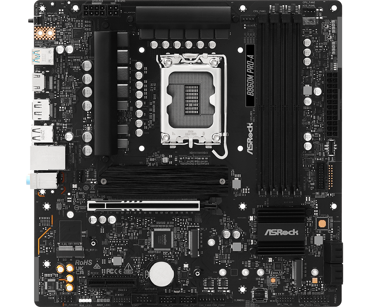 Piegāde visā Vācijā un iespēja saņemt pasūtījumu izsniegšanas punktā. Ērti norēķinu veidi. Iespēja apmaksat tieši interneta veikalā, ar karti vai skaidrā naudā preces saņemšanas punkta. Detalizēts preču apraksts un salīdzināšanas iespēja. Populārākie zīmoli no pasaules ražotājiem. 112,70 € Preces ID: 32136 Pamatplate ASRock B860 B860M Pro-A Black (90-MXBRR0-A0UAYZ) PamataRažotājs ........................................................................................................................................................................................................ Ražotāja kods ........................................................................................................................................................................................................ 90-MXBRR0-A0UAYZ Socket ........................................................................................................................................................................................................ LGA 1851 Mikroshēmu kopa (Chipset) ........................................................................................................................................................................................................ Intel B860 AtmiņaAtmiņas veids ........................................................................................................................................................................................................ DDR5 Atmiņas slotu skaits ........................................................................................................................................................................................................ 4 Diska kontrolieriSATA kontrolieris ........................................................................................................................................................................................................ 4 x SATA-III (6 Gb/s) RAID atbalsts ........................................................................................................................................................................................................ 0, 1, 5, 10 Paplašināšanas slotiPaplašināšanas sloti ........................................................................................................................................................................................................ PCI-E 5.0 x16, PCIe 4.0x4, PCI-E M.2 Audio/VideoSkaņa ........................................................................................................................................................................................................ 8 kanāli (7.1) Audio kontrolieris ........................................................................................................................................................................................................ Realtek ALC897 TīklsTīkla saskarne ........................................................................................................................................................................................................ 2.5 Gigabit Ethernet (100/1000/2500 Mb/c) Tīkla kontrolieris ........................................................................................................................................................................................................ Dragon RTL8125BG SaskarnesLigzdas aizmugurējā panelī ........................................................................................................................................................................................................ 2 x USB 2.0, LAN, 3 x audio jacks, 3 x USB 3.2 Gen1, USB 3.2 Gen2x2 Type-C, HDMI, DisplayPort, RJ-45 PapilduLigzdas korpusa ventilatoru pieslēgšanai ........................................................................................................................................................................................................ 3 x 4-pin ATX 12 V barošanas ligzda ........................................................................................................................................................................................................ 4-pin, 8-pin Iekšējās USB pieslēgvietas platē ........................................................................................................................................................................................................ 2 x USB 2.0, 2 x USB 3.2 Gen1 ARGB 5V savienotāji uz plates ........................................................................................................................................................................................................ 3 x 3-pin RGB 12V savienotāji uz plates ........................................................................................................................................................................................................ 4-pin Formfaktors ........................................................................................................................................................................................................ mATX Piegādes veids ........................................................................................................................................................................................................ Retail Noformējumā izmantotās krāsas ........................................................................................................................................................................................................ melns PapildusGarantija ........................................................................................................................................................................................................ 1